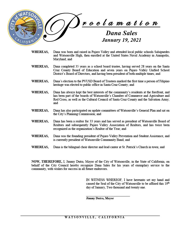 Dana Sales (27th Co.) recognized for 35 years as a local and county school board trustee and as the first person of Filipino ancestry elected to public office in the history of Santa Cruz County. At the January 19, 2021 meeting of the City of Watsonville City Council, the follow ing proclamation was passed: