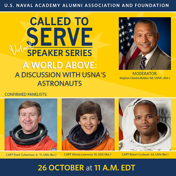 A World Above: A Virtual Discussion with USNA’s AstronautsIn three flights, CAPT Frank Culbertson, Jr. ’71, USN (Ret.), logged 144 days in space. CAPT Wendy Lawrence ’81, USN (Ret.), spent 51 days in space over four trips. CAPT Robert Curbeam ’84, USN (Ret.), is a veteran of three space flights totaling more than 37 days.Naval Academy alumni have a unique perspective of the challenges, opportunities and rigors associated with being a member of the astronaut community.Join CAPT Culbertson, CAPT Lawrence and CAPT Curbeam as they provide insight and anecdotes about their experiences in the space program, memories of orbiting Earth and what it took to earn a place in space. They’ll share the lessons learned at the Academy they leaned on during NASA’s arduous selection and training process.MajGen Charles Bolden ’68, USMC (Ret.), an astronaut who made four space flights and the former NASA Administrator, will moderate the discussion.Register online here.For more information, contact events@usna.com. |