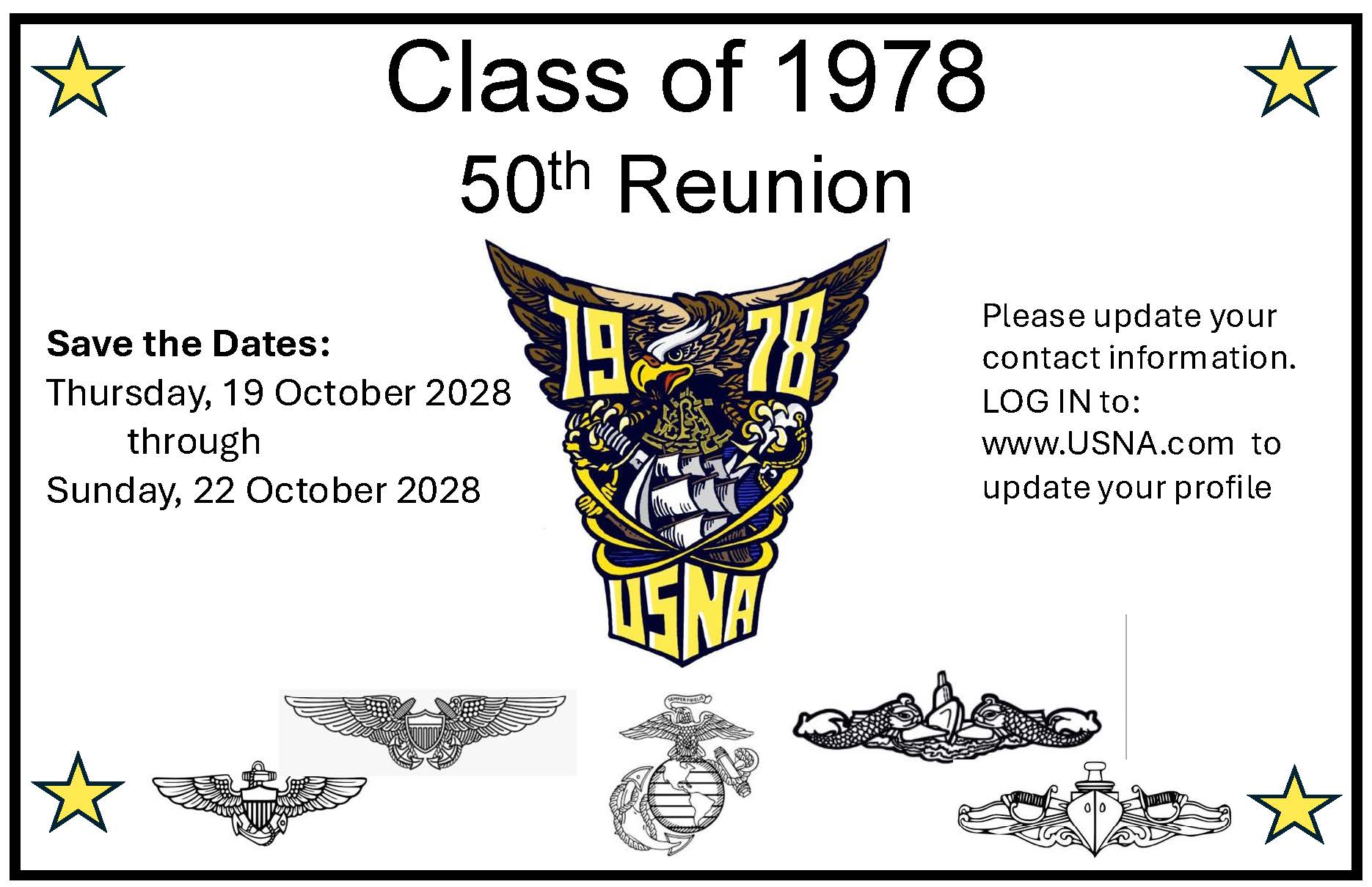 We will be communicating regularly about the reunion in this forum and others. Read your emails, check Facebook and stay in touch with company-mates. Finally… please make sure your contact information is up-to-date on the USNA.com website.