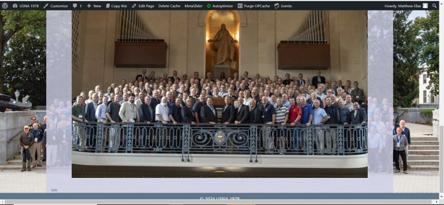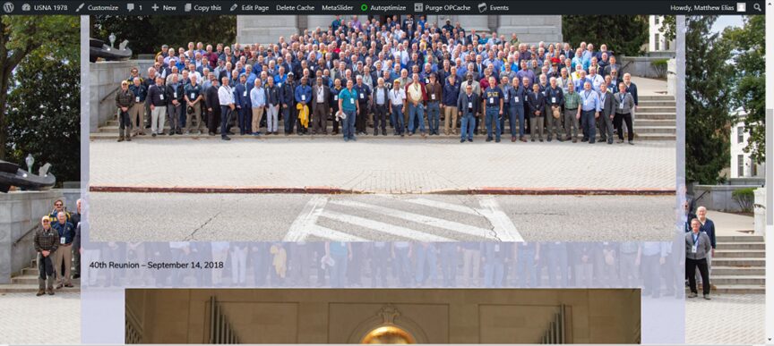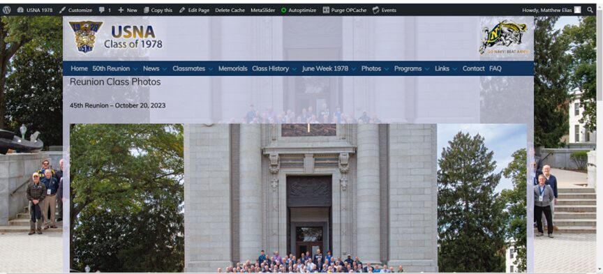 A new page, Class Reunion Photos, has been created and added under the Photos section for our reunion class photos. The 40th and 45th class reunion photos, which were previously just the website background, are now available under Photos at https://www.usna1978.org/reunion-class-photos/.