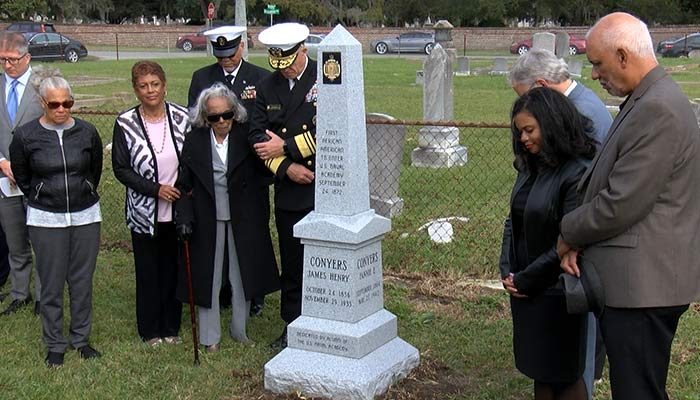 In September 1872, James H. Conyers reported to the U.S. Naval Academy as the first African American to attend the Academy. 150 years later on 14 November, Conyers’ family members, Naval Academy Superintendent VADM Sean Buck ’83, USN, USNA AA&F President and CEO Jeff Webb ’95, and members of the alumni community gathered in Conyers’ hometown of Charleston, SC, to honor his life and mark this significant USNA milestone. Unfortunately, Conyers did not complete his four years at the Academy due to racially-motivated abuse. However, he did pave the way for future African American midshipmen and his legacy lives on today. The keynote speaker for the ceremony was 2018 USNA Distinguished Graduate MajGen Charles Bolden Jr. ’68, USMC (Ret.). The Naval Academy Minority Association (NAMA) Shared Interest Group, directed by RADM Julius Caesar ’77, USN (Ret.), organized and hosted the gathering. Conyers’ legacy as a Naval Academy pioneer is now rightfully etched in stone in Charleston, and in the hearts of all who honor his courage.