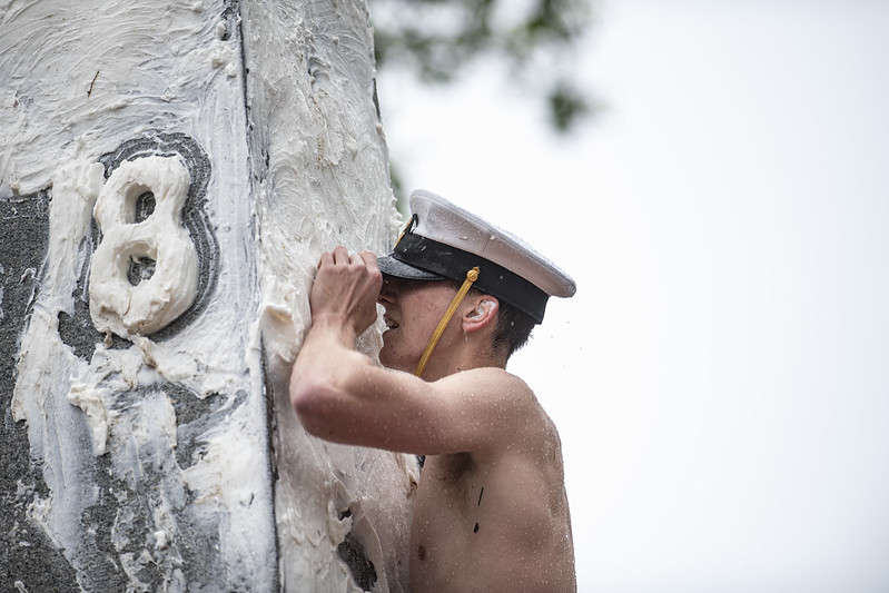 At 10:28 a.m. Wednesday, midshipmen fourth class Augustus “Gus” Russo, 20, extended his arms to the top of the Herndon Monument, lost his footing and tumbled 21-feet into the hundreds of fellow plebes below.    Less than five minutes later, at 10:32 a.m., the 6-foot-five-inch resident of Summit, New Jersey, removed the underclassman “Dixie Cup” hat and replaced it with a midshipman’s cover as cheers of “Plebes no more” erupted.   “I’m so proud of all of you,” Russo, a member of 17th Company said after acknowledging his parents in the crowd. “We were out there at Sea Trials yesterday, I woke up exhausted, my arms were cramping, I couldn’t even do a sit-up out of bed. We still went out there and we conquered.”   The annual Herndon Monument Climb is the culmination of plebe year at the Naval Academy. The event demonstrates the teamwork and perseverance that first-year midshipmen learned throughout their year at the academy.   Plebes build a human pyramid around the 21-foot obelisk caked in vegetable shortening and replace the underclassman hat with an upperclassman’s hat. After the class of 2028 completed the task in two hours, 27 minutes and 31 seconds they are no longer considered plebes but “fourth class midshipmen.”   “For all of the families and guests here, you should be so proud of your midshipmen fourth class,” Superintendent Vice Adm. Yvette Davids said. “The class of 2028 has always, from the moment they came here, been very distinctive. They have been prepared mentally, morally and physically from the very beginning. I am not surprised that they did so well today.”